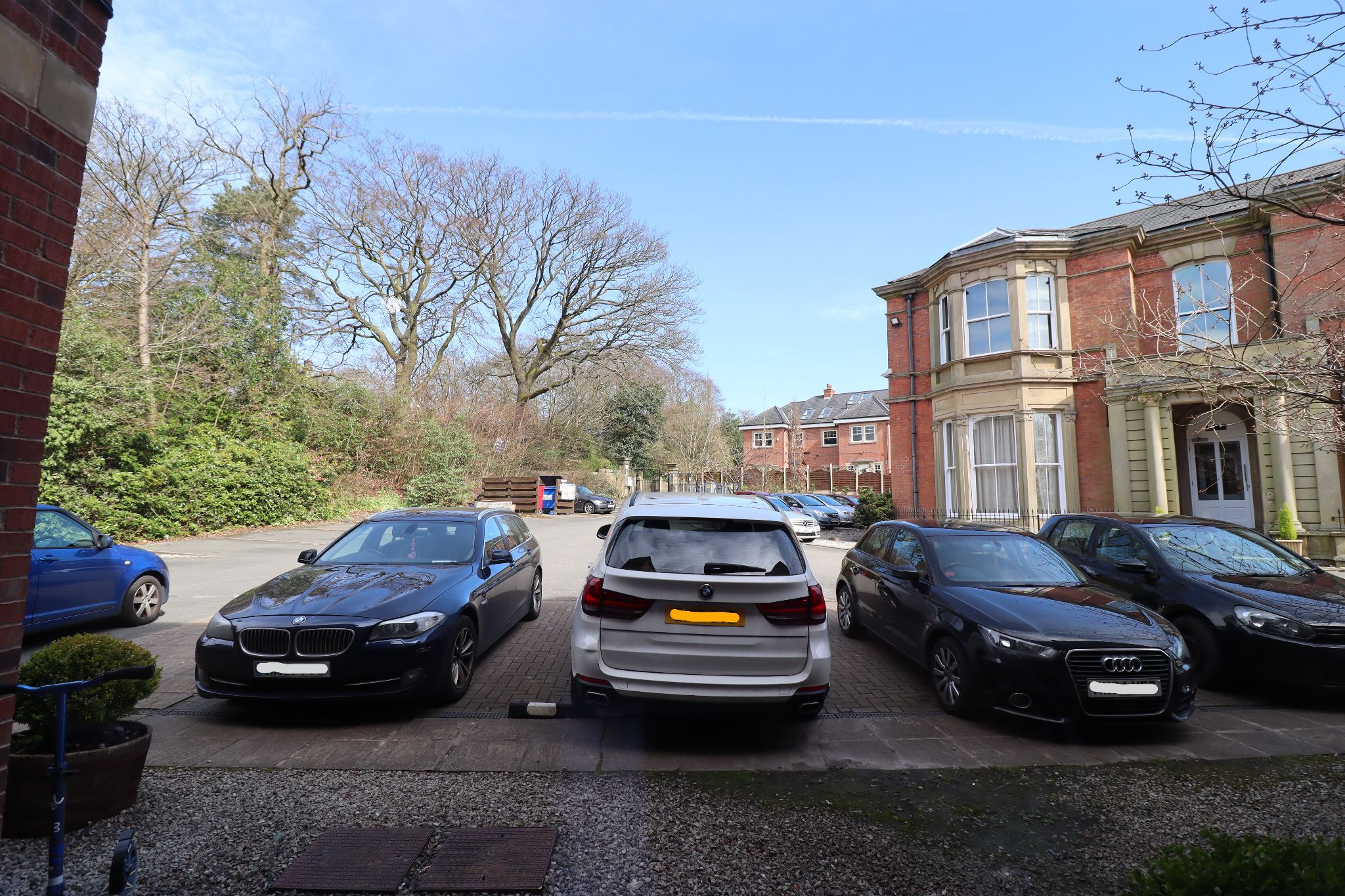 Upon entering through electric gates into the residential parking area, there is a communal entrance leading to the apartment.